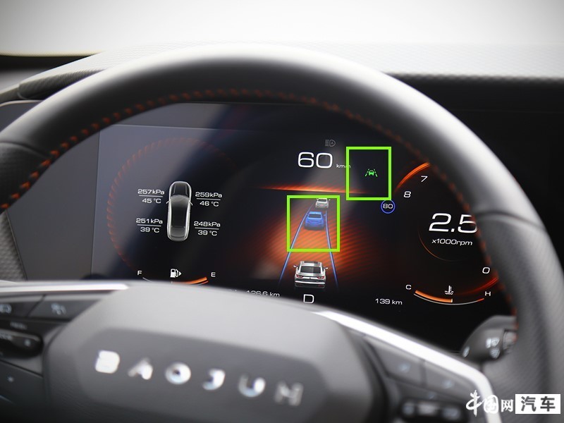 轻点油门后,车辆便会锁定前方车辆并与之跟行(此时前方车辆图标变为蓝色),当液晶仪表盘中的两侧道路显示变为蓝色,就意味着车道保持以及车道偏离也就随应开启,界面直观,信息直给。