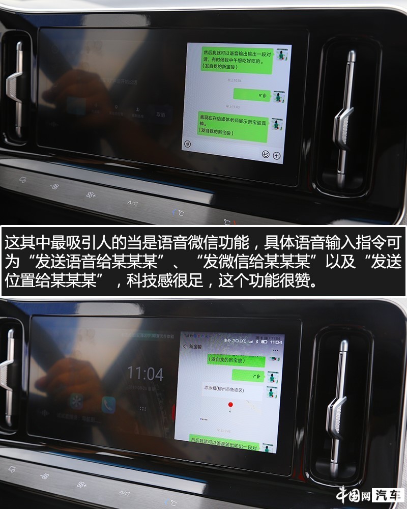这其中最吸引人的当是语音微信功能,具体语音输入指令可为“发送语音给某某某”、“发微信给某某某”以及“发送位置给某某某”,说完这些指令后,中控屏的分屏功能就会被激活,同时右侧区域会调出微信的界面,并对输入指令完成操作,识别准确性很高,说完后可以在屏幕上看着它一步一步完成操作,科技感很足,这个功能很赞。