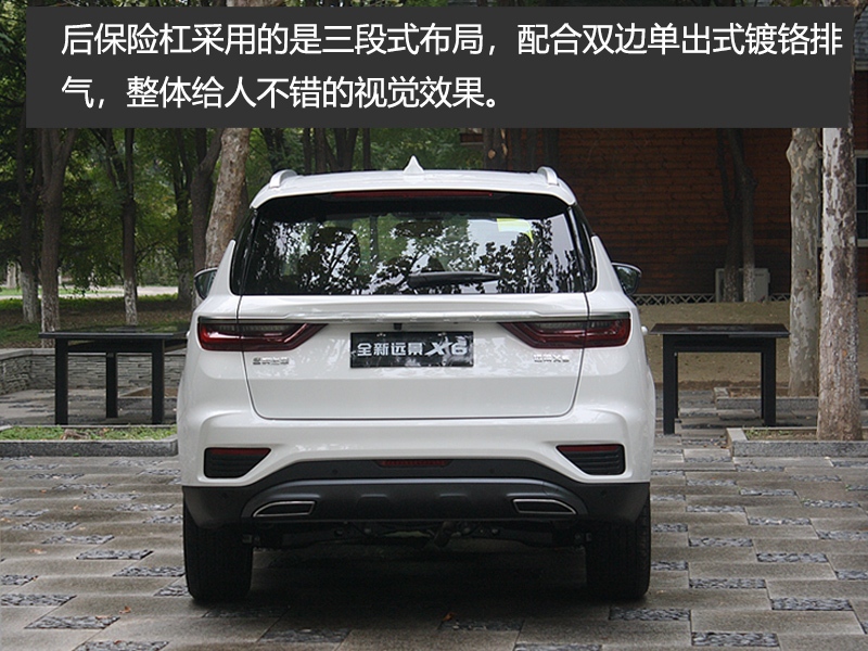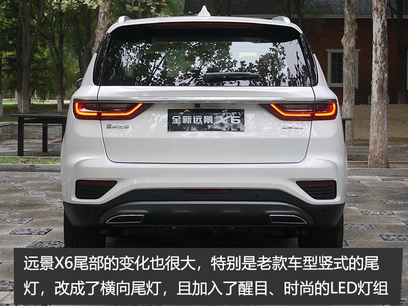 尾部方面,远景X6的变化也很大,特别是老款车型竖式的尾灯,改成了类似于帝豪GL的横向尾灯,且加入了醒目、时尚的LED灯组设计。同时,后保险杠采用的是三段式布局,配合双边单出式镀铬排气,整体给人不错的视觉效果。