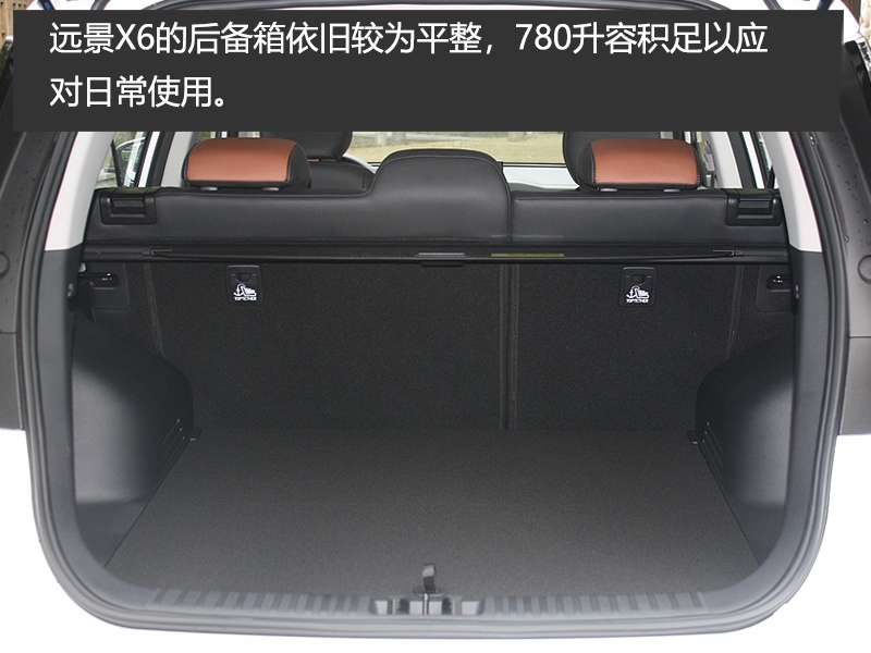 远景X6的后备箱依旧较为平整,780升容积足以应对日常使用。当后排座椅进一步放倒之后 ,容积可以拓展到1850升,且接近于纯平状态。