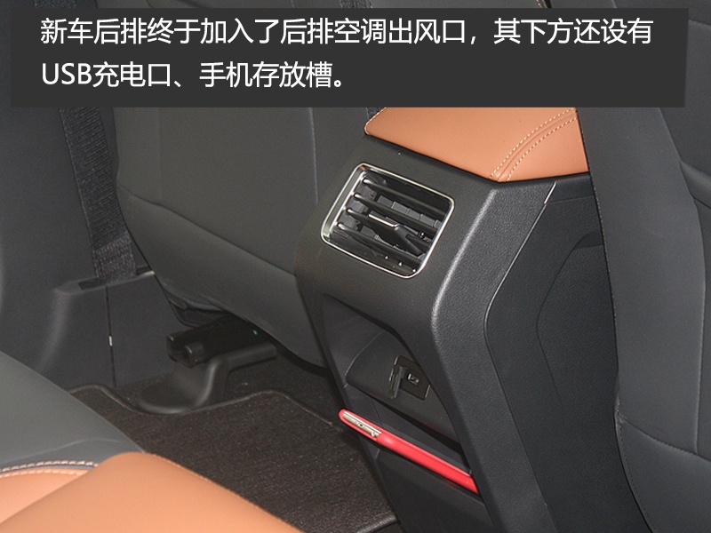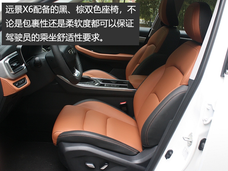 远景X6配备的黑、棕双色座椅,不论是包裹性还是柔软度都可以保证驾驶员的乘坐舒适性要求。值得一提的是,中央扶手箱里还加入了出风口,随手饮料都可以放在这里保温或冷却。后排不论是腿部空间还是头部空间,也都非常令人满意。此外,新车后排终于加入了后排空调出风口,其下方还设有USB充电口、手机存放槽。