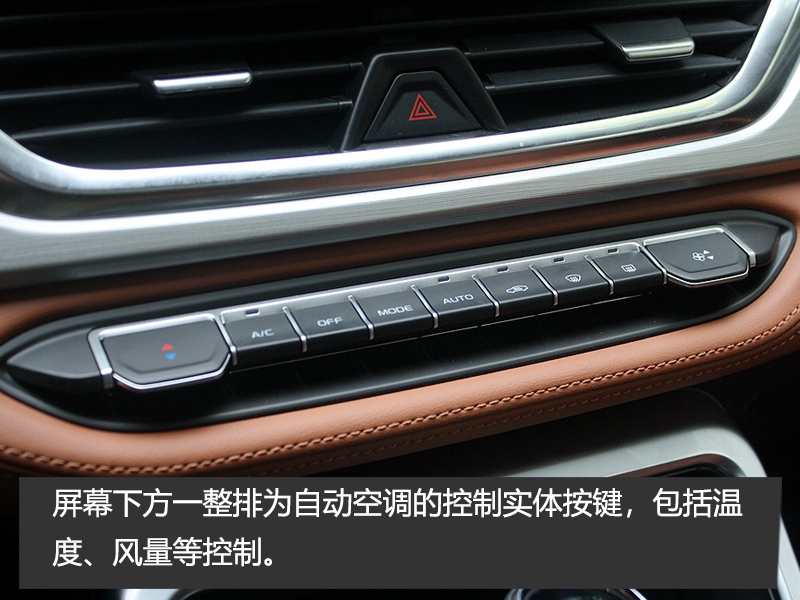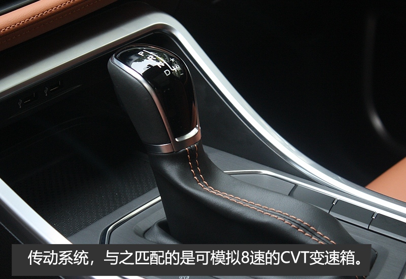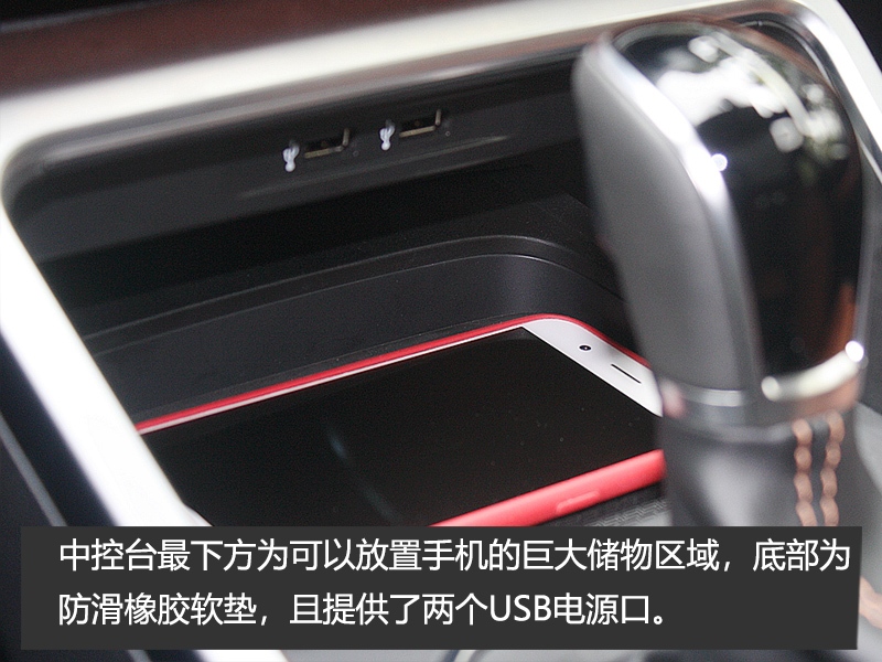 中控台最下方为可以放置手机的巨大储物区域,底部为防滑橡胶软垫,且提供了两个USB电源口。挡杆后方布置了一系列的实体按键,包括电子手刹、自动驻车、全景影像等。