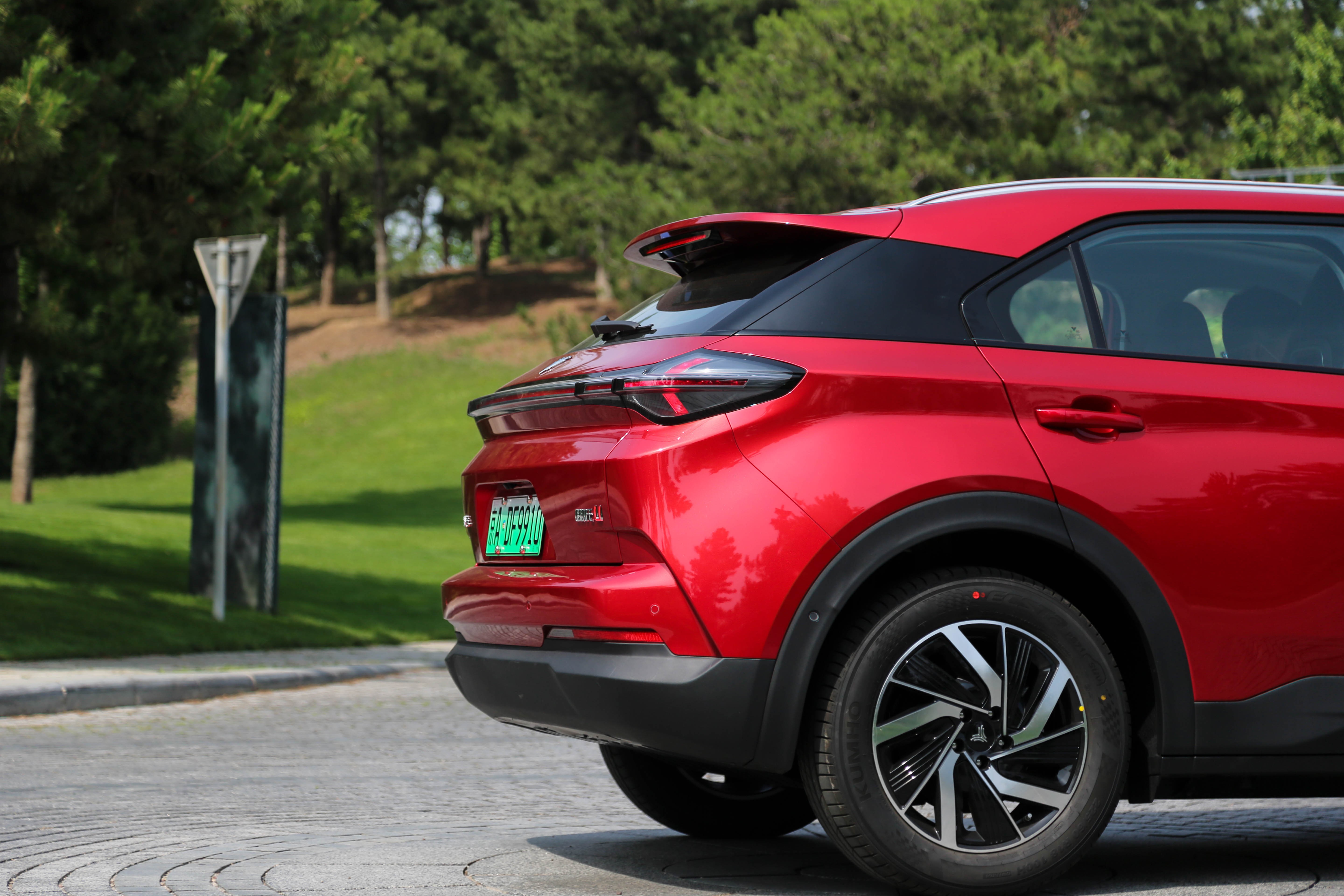 此次试驾车辆配备的是规格为225/60 R18的ECSTA PS71 SUV系列锦湖轮胎,而顶配车型配备的规格则是225/55 R19。值得一提的是,该双色轮圈中的黑色部分为封闭的饰板,可以降低一定的风阻,另外还可根据个人爱好选装不同的颜色。