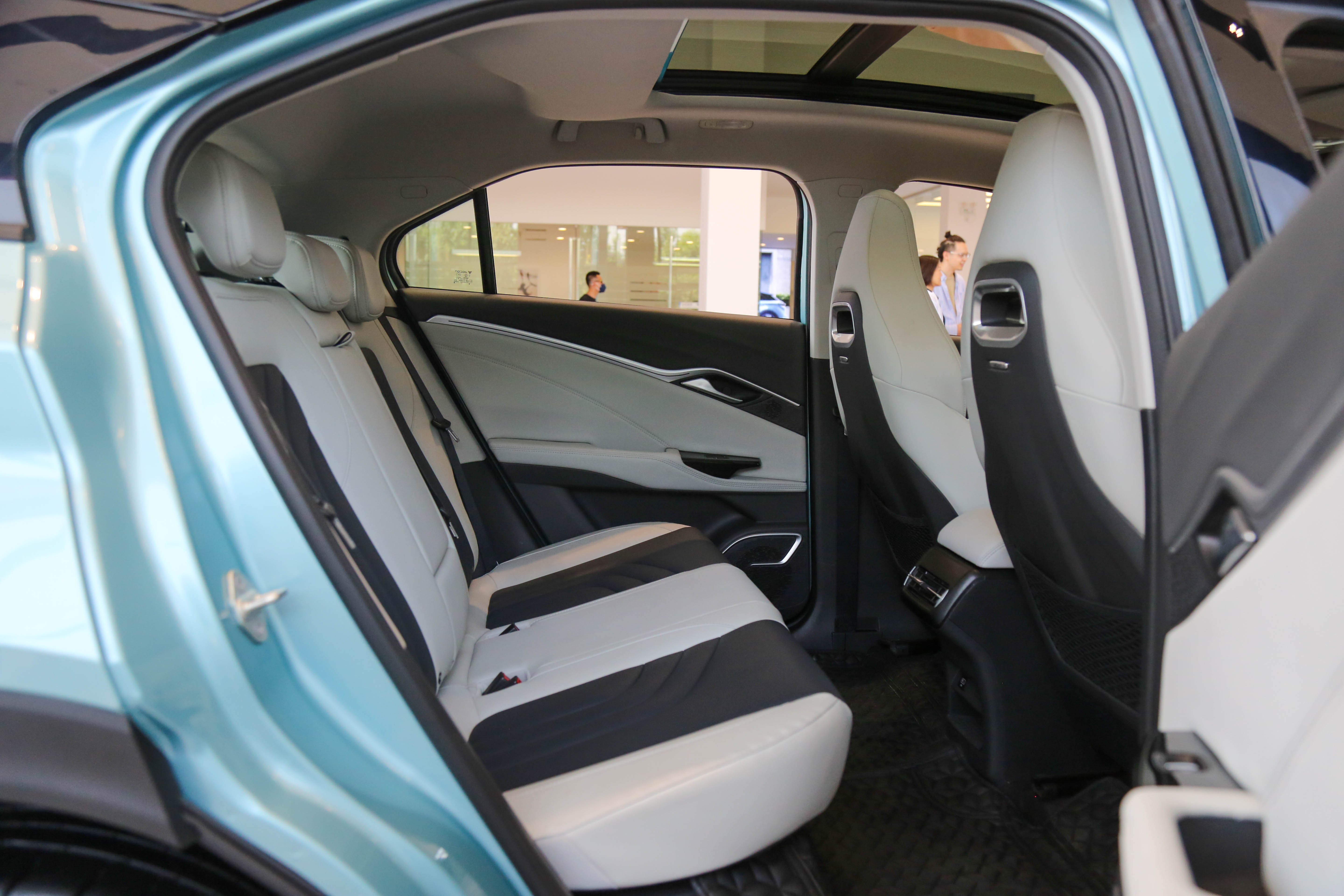 后排的乘坐空间非常宽裕,与四轮四角的设计不无关系,坐垫的填充物也很柔软,俯仰角度也还不错。另外,中央地板没有突起,44码的鞋可以轻松安放,配置方面还配备了空调出风口以及一个USB接口。