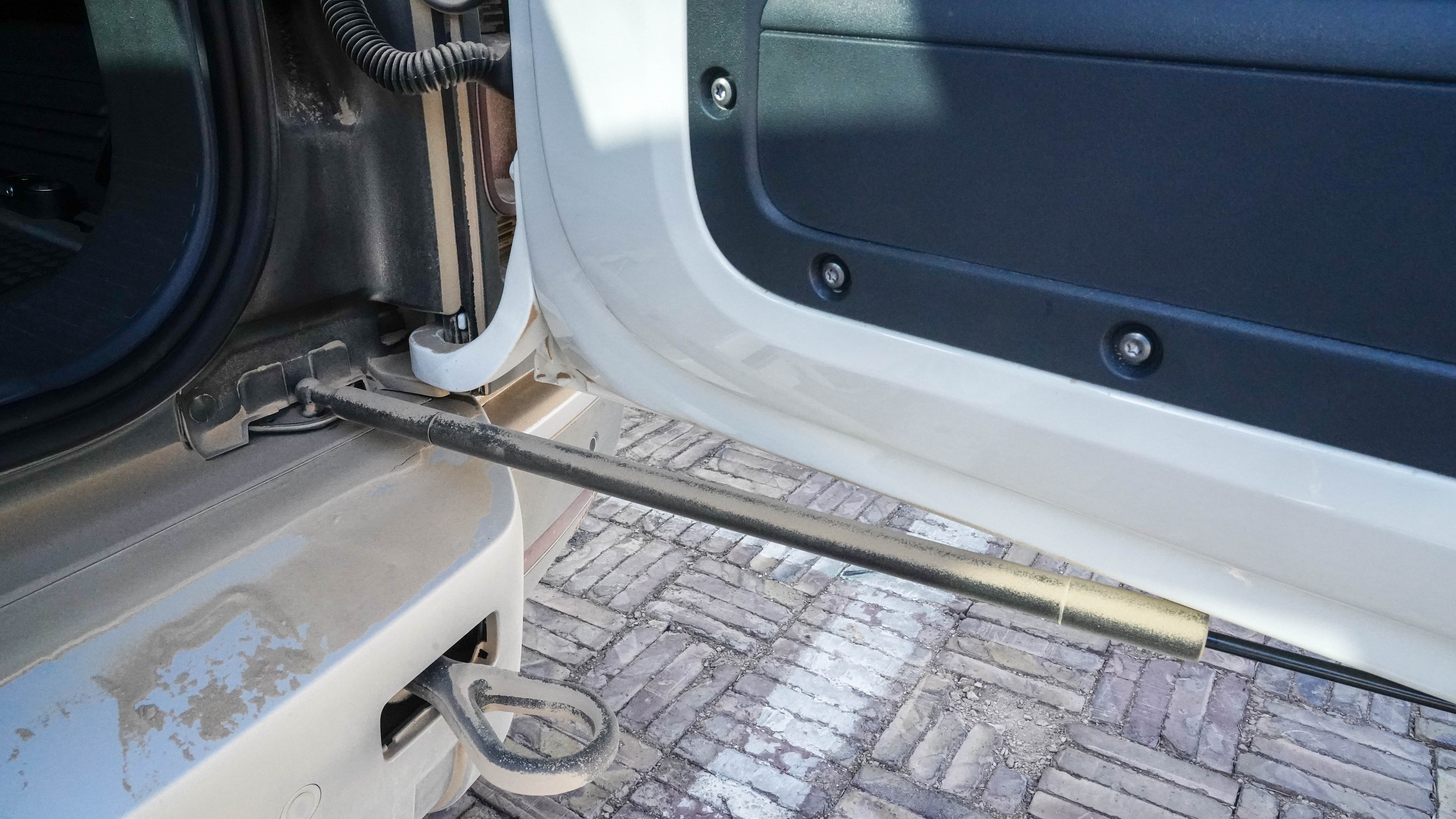 尾门下方有无限限位的液压杆,即使停在斜坡上,也可以保证任意的角度开启后都不会关上车门,很人性化的设计。