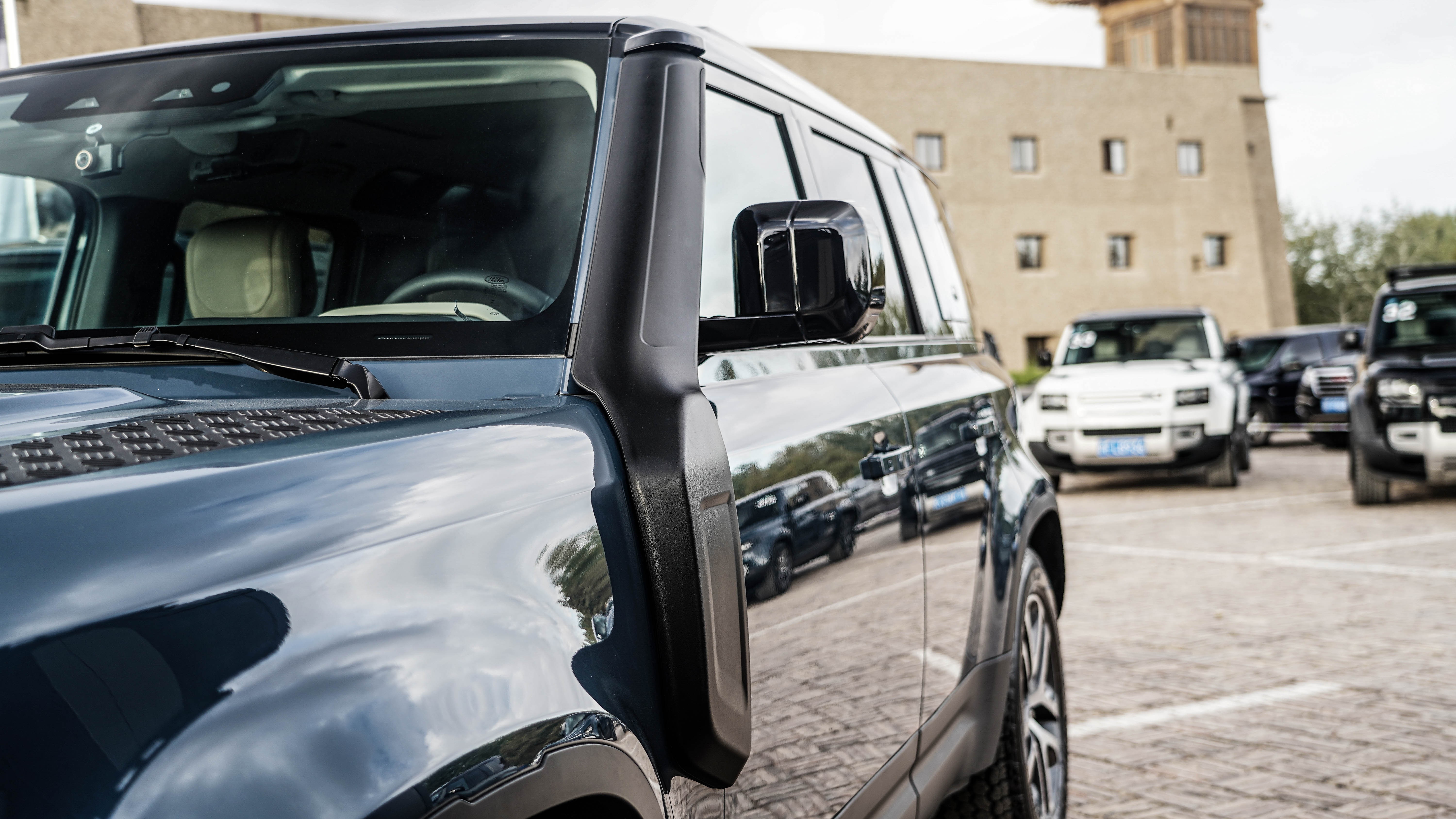 进气口位于左前门的开合处,可以帮助其完成900mm的最大涉水深度,作为对照,奔驰G500的涉水深度为700mm,牧马人为762mm。此外,官网还可以选装高位进气口,帮助吸入发动机舱盖上方的清洁空气,更加有利于减少灰尘的吸入,但需要注意的是高位进气口并不能提高车辆的涉水性能,依然保持900mm的涉水深度。
