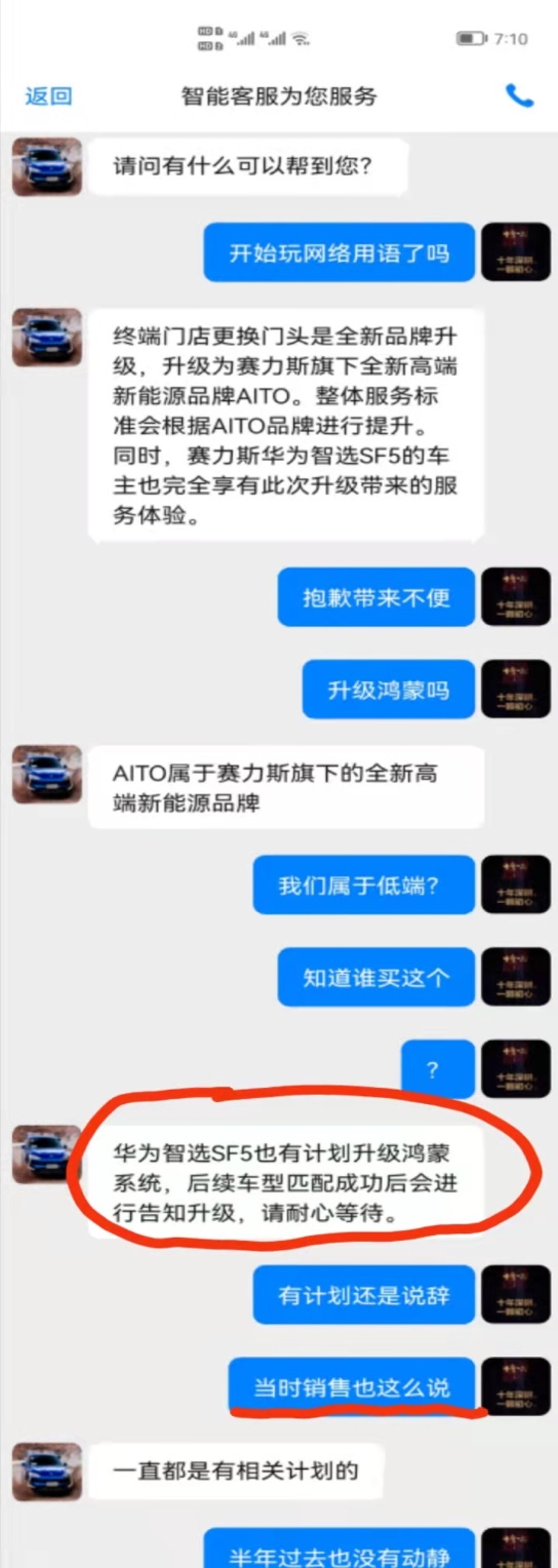 中国网汽车频道旗下《小马说车》栏目随后也联系到了深圳华为旗舰店万象天地店的工作人员,对方却给出了另一番答复:“我们没有说是鸿蒙系统,它叫HiCar,是华为车载互联。其实,日常的一些导航、音乐都是完全OK的。”但车主向中国网记者解释道,所谓的华为HiCar使用很不方便,有时候车机非常卡顿,并不是真正的鸿蒙系统。通过查看车主与赛力斯客服、销售人员的聊天记录,记者发现彼时后者承诺过华为智选SF5是可以升级成鸿蒙OS系统。车主还向记者爆料,赛力斯官方曾用了两天时间对赛力斯APP进行了重大“更新”,将有关鸿蒙的宣传资料全部删除。除无法升级鸿蒙系统外,华为智选SF5又被爆出车载Wi-Fi热点功能丢失。
