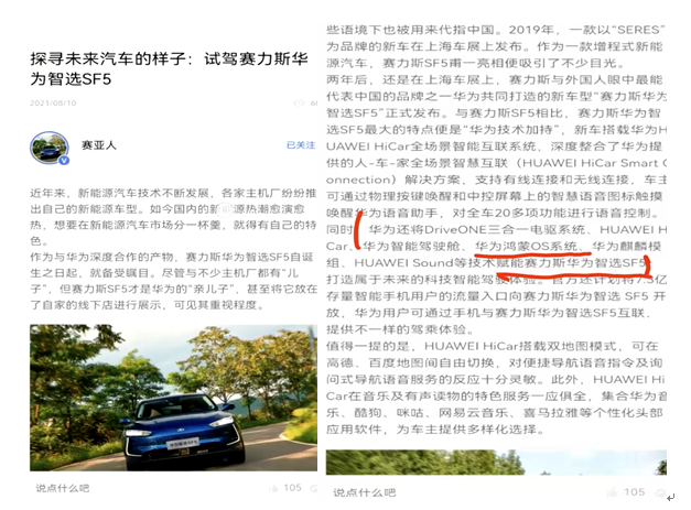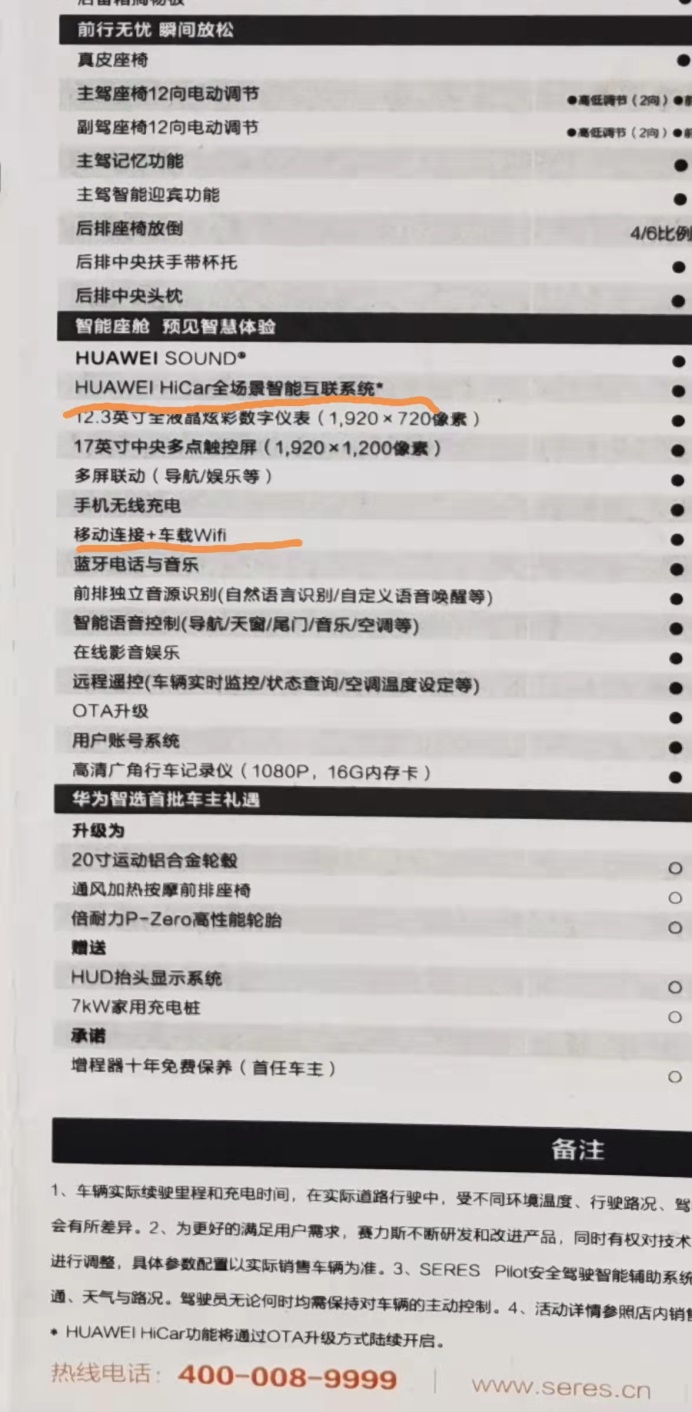 令所有车主大失所望的是,赛力斯厂家官方APP和宣传单页上所体现的“华为将鸿蒙OS系统等技术赋能赛力斯SF5”、“车辆搭载车载Wi-Fi和HUAWEI HiCar”,最终却都未能兑现。“有华为做靠山,升级鸿蒙系统不是很简单的一件事情嘛,当时潜意识就是这么认为的。但是后面他们全部都改口,全部都不承认了。”王先生十分后悔当初的选择。
