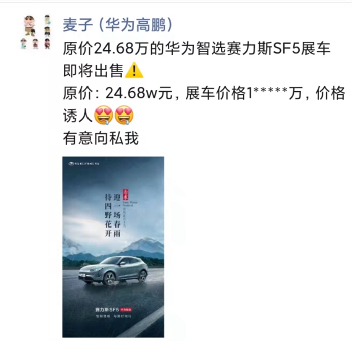 正是冲着“华为”的招牌而来,重庆的王先生于去年9月份在华为某手机店订购了一台赛力斯华为智选SF5。其进一步表示:其实90%的车主都是冲着华为去的,结果把车主们都“搞心寒”了。无独有偶,另外一位车主余先生同样是在华为深圳万象天地旗舰店购买的赛力斯SF5。