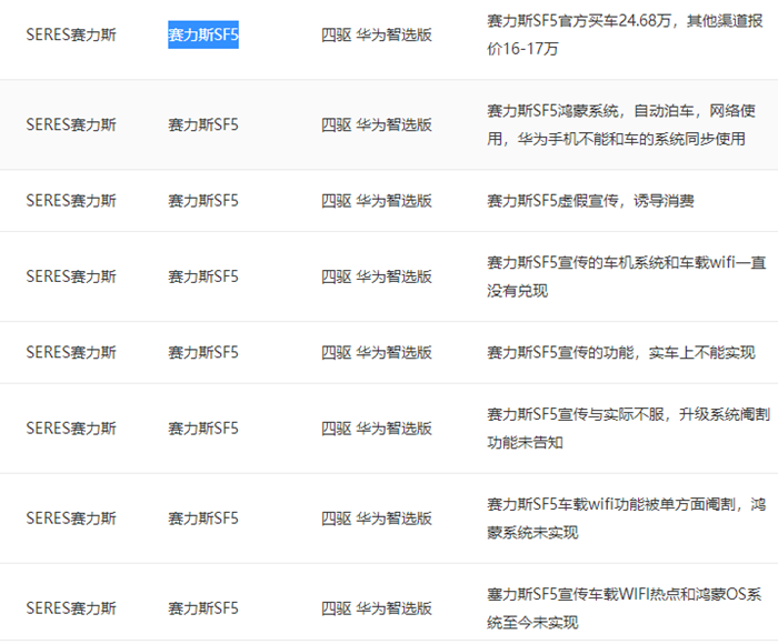 中国网汽车3月28日讯(记者 李池)中国网汽车质量平台近日接到大量赛力斯华为智选SF5车型车主的投诉,问题主要集中于车辆无法升级到鸿蒙OS系统、车载WIFI功能缺失,赛力斯因此涉嫌虚假宣传、误导消费者。