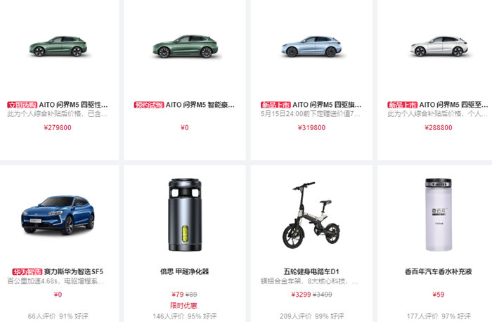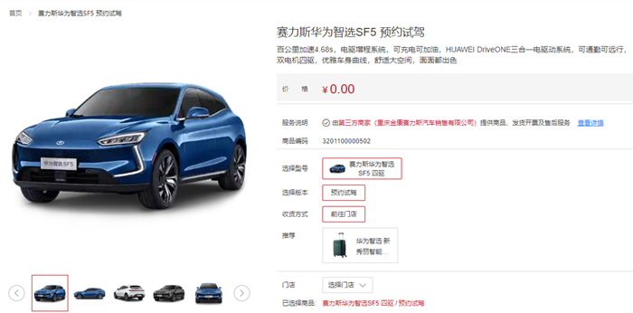 在车主集体投诉之下,华为随后又上线了SF5,但根本无人购买。记者在华为官方商城通过搜索“赛力斯”,前几条出现的都是AITO问界M5车型的“立即选购”标签,赛力斯SF5只是提供了一条0元预约试驾标签,并不接受网上选购。“赛力斯纯属就是为了忽悠我们,还声称只是暂时给问界M5让生产线,纯粹是为了敷衍而做的事情。” 有车主直言。