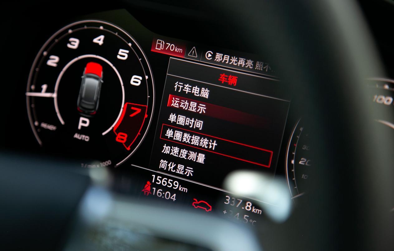 仪表盘中央的“运动显示”、“单圈数据统计”、“加速度测量”等信息,时刻告诉驾驶者这是一台对于性能有执着追求的奥迪汽车。那些真的对性能热爱的人,也一定会在这些信息中找到乐此不疲的乐趣。