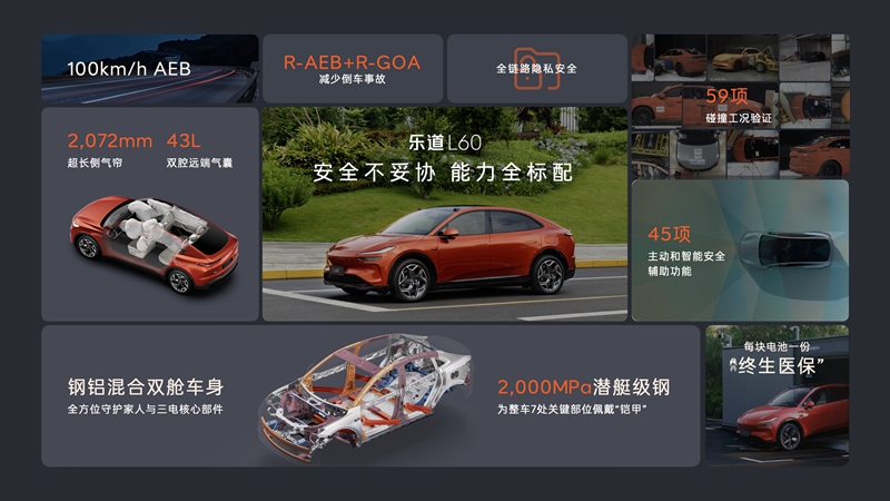 在车辆安全方面,乐道L60采用钢铝混合双舱车身,整车7处关键部位采用2000MPa潜艇级钢材;全系标配45项主动智能安全配置,夜间AEB最高刹停时速高达120km/h。