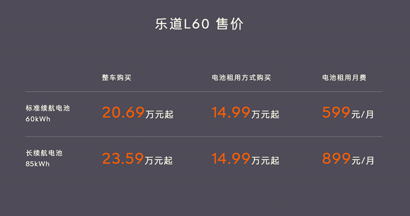 如果采用电池租用方式购买,裸车价格仅14.99万元;标准60kWh版,电池月租费用599元/月;长续航85kWh版,电池月租费用899元/月。鉴于乐道和蔚来一样也支持换电,因此采用BAAS电池租用的方式买车或是最佳选项,尤其是对预算有限的年轻购车群体。尽管乐道L60目前可用换电站仅304座,但官方表示今年年底乐道可用换电站将达到 1000+座。