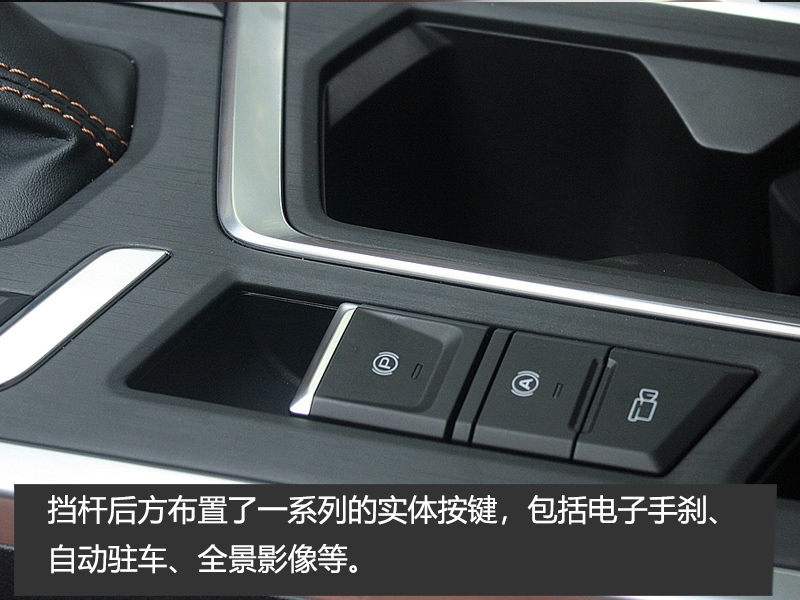 中控台最下方为可以放置手机的巨大储物区域,底部为防滑橡胶软垫,且提供了两个USB电源口。挡杆后方布置了一系列的实体按键,包括电子手刹、自动驻车、全景影像等。