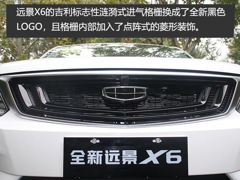 外观方面,远景X6整体造型基本延续了远景SUV的设计,但细节上的改动还是让新车看起来更加精致了许多。首先,远景X6的吉利标志性涟漪式进气格栅换成了全新黑色LOGO,且格栅内部加入了点阵式的菱形装饰。LOGO的上方还设有前置摄像头。