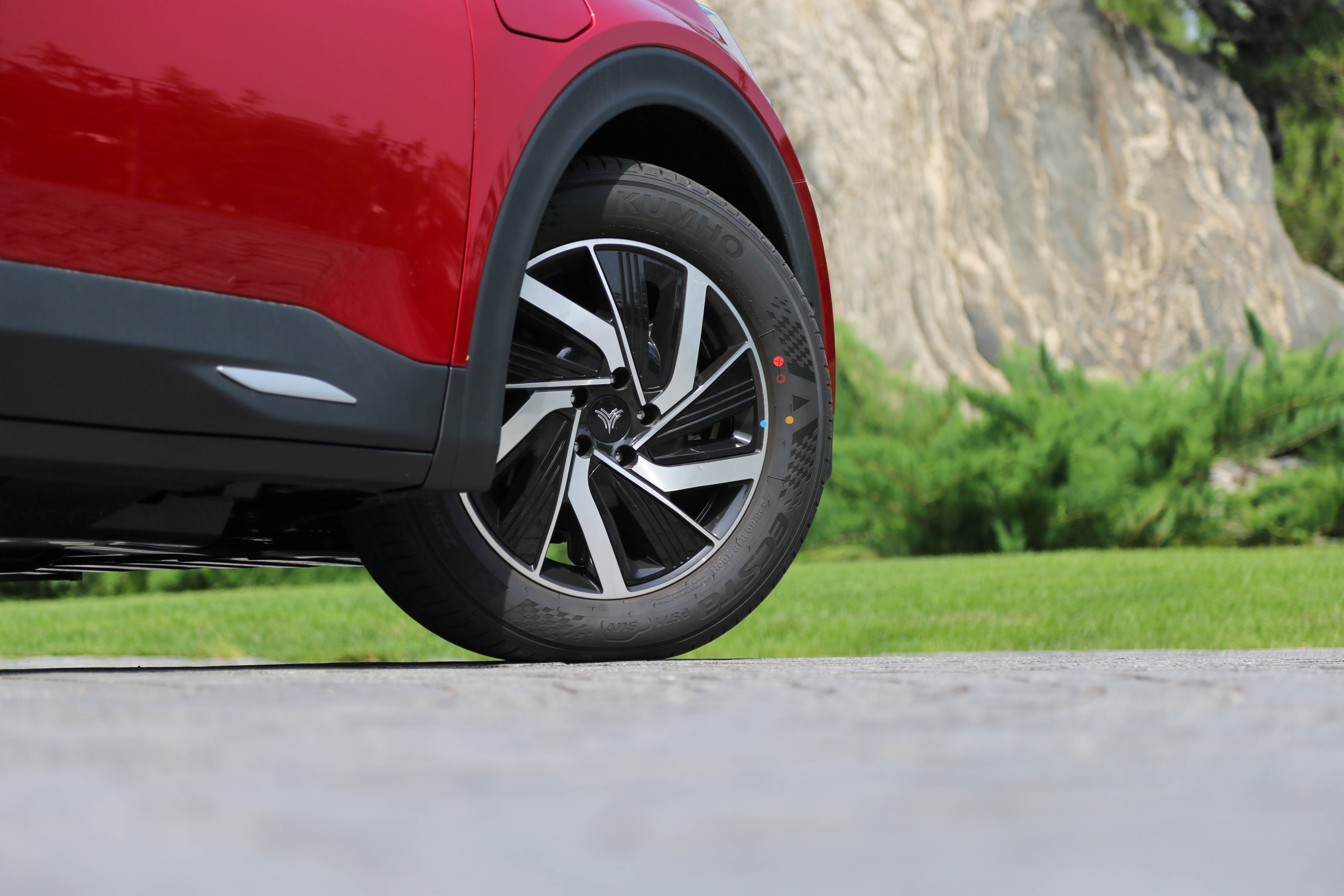 此次试驾车辆配备的是规格为225/60 R18的ECSTA PS71 SUV系列锦湖轮胎,而顶配车型配备的规格则是225/55 R19。值得一提的是,该双色轮圈中的黑色部分为封闭的饰板,可以降低一定的风阻,另外还可根据个人爱好选装不同的颜色。